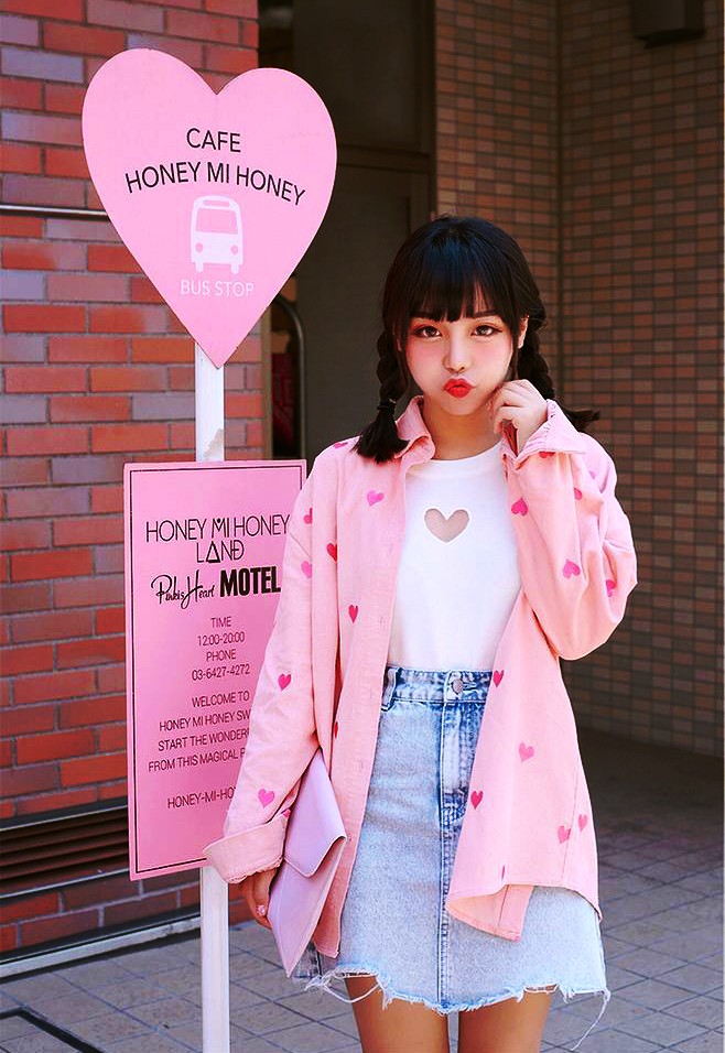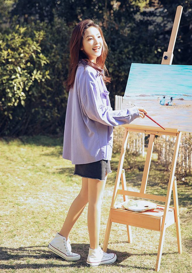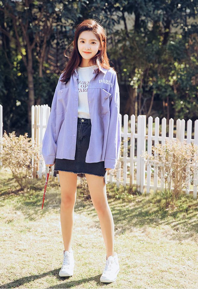 淡紫色燈芯絨襯衫搭配牛仔短裙,率性,灑脫
