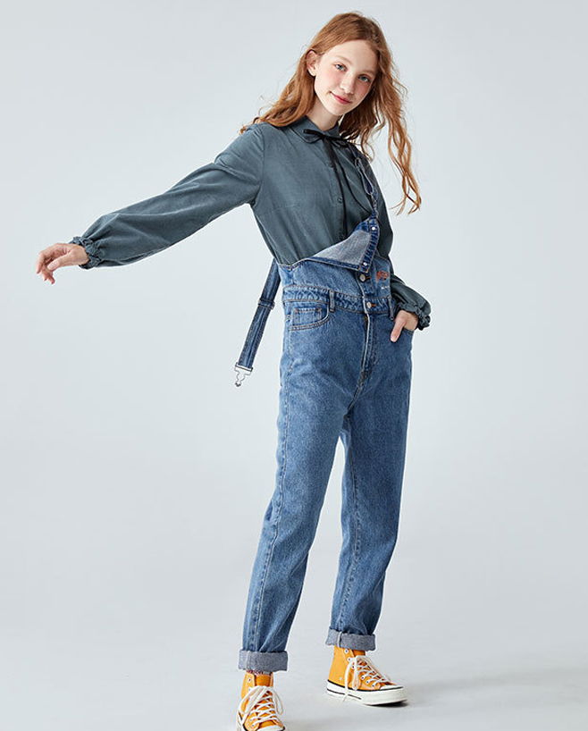 灰色細(xì)條絨燈芯絨襯衫搭配吊帶牛仔褲板鞋