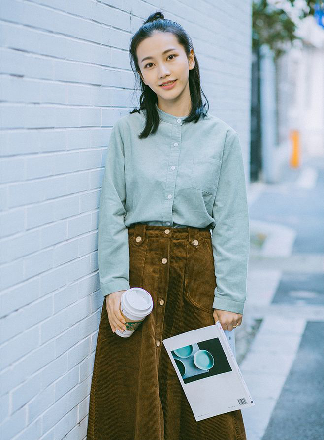 淺藍(lán)立領(lǐng)燈芯絨襯衫搭配燈芯絨A字裙