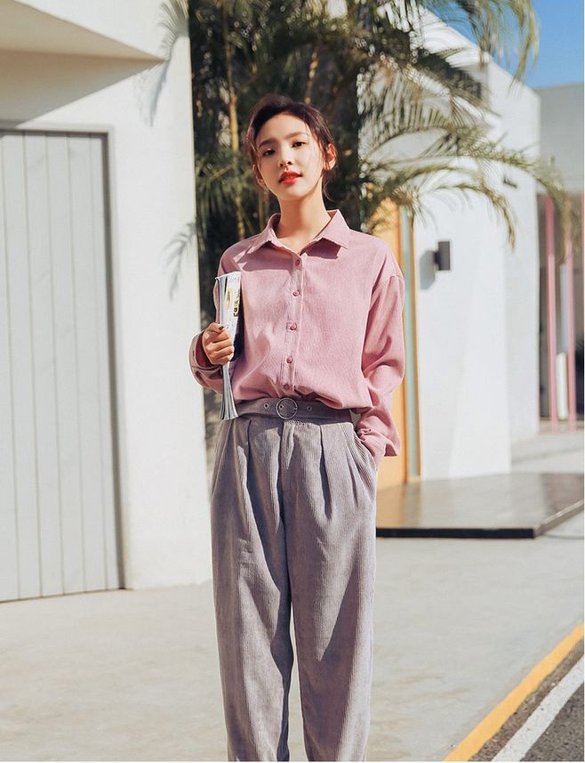 藕粉色燈芯絨襯衫,搭配燈芯絨褲子