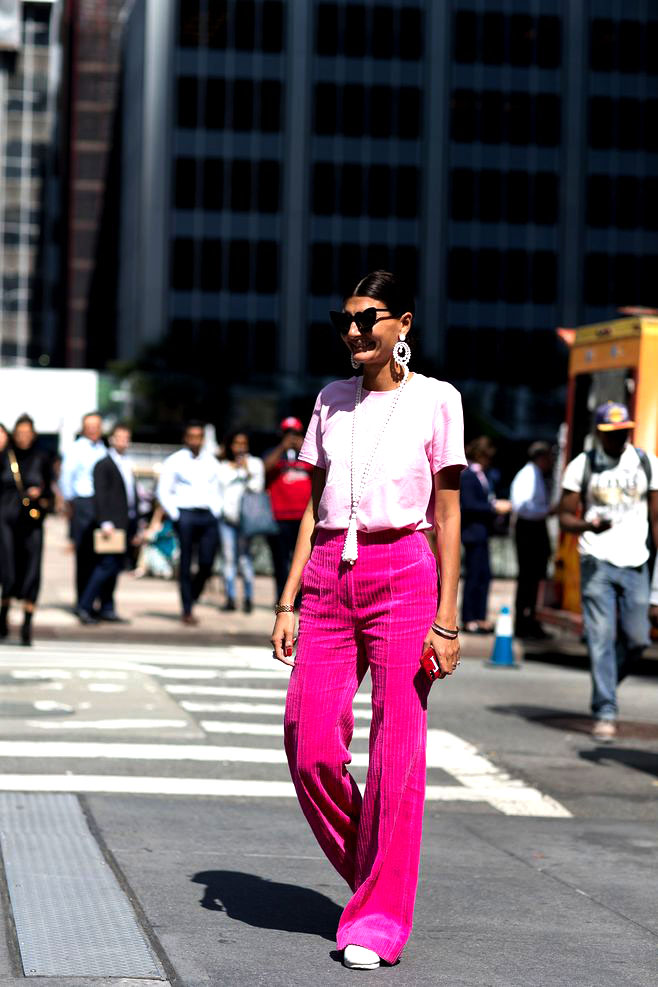4.5條子母條燈芯絨做成的闊腿褲,粉色亮色色系非常亮眼。