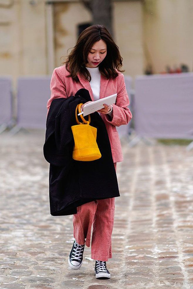 燈芯絨面料,條數(shù)越少,條絨就越粗。一般4.5條以下的燈芯絨都算是粗條燈芯絨,粗條燈芯絨,因條絨較粗曠,厚實飽滿,一般粗條燈芯絨面料都是做家紡的用途較多。如:抱枕、靠墊、沙發(fā)椅套等,其實粗條燈芯絨在時尚界也是大放異彩,特別深受歐美國家消費(fèi)者的喜好,下面我們來看看時尚街拍: