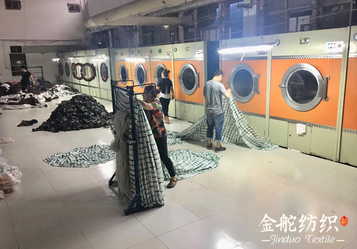 水洗廠大型烘箱 燈芯絨水洗后經(jīng)過烘箱,燈芯絨掉落的毛線會在旋轉(zhuǎn)過程中,掉落到烘箱并被吸走!