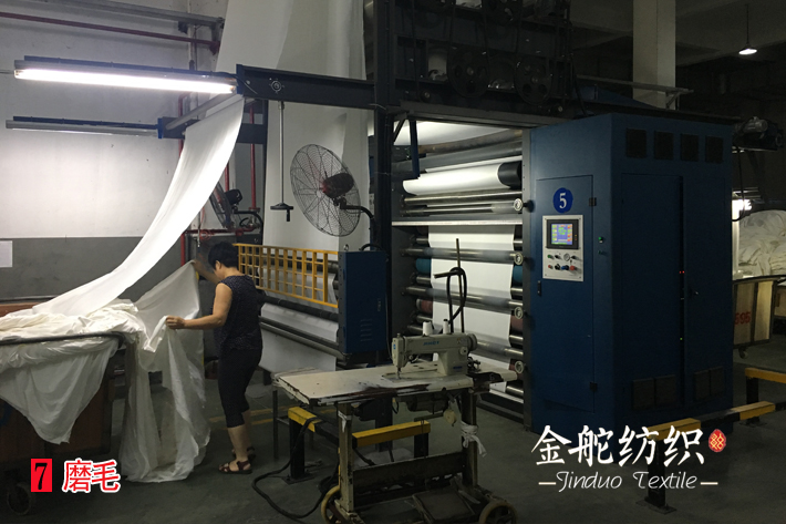 7,磨毛,麂皮絨起絨的關(guān)鍵,通過(guò)綁有金剛砂紙的橡膠棍高速轉(zhuǎn)動(dòng),磨擦起絨