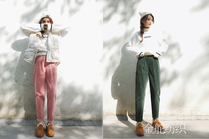 這幾年很火的8條燈芯絨做成的燈芯絨老爹褲,8條不粗也不細。燈芯絨褲子一般以細條為主如16條,21條等。