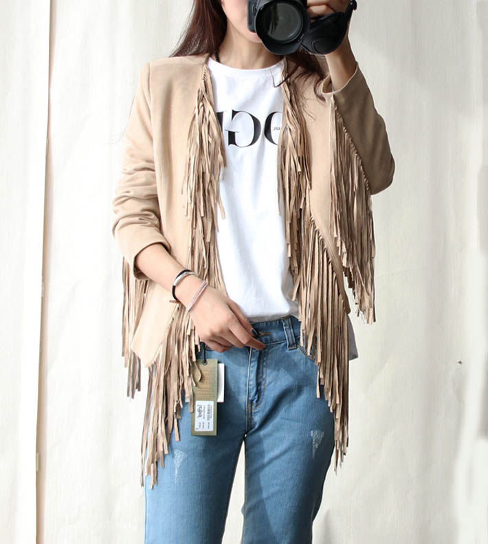 米色麂皮流蘇外套,整齊排列下垂的流蘇,視覺上更顯纖瘦與灑脫。