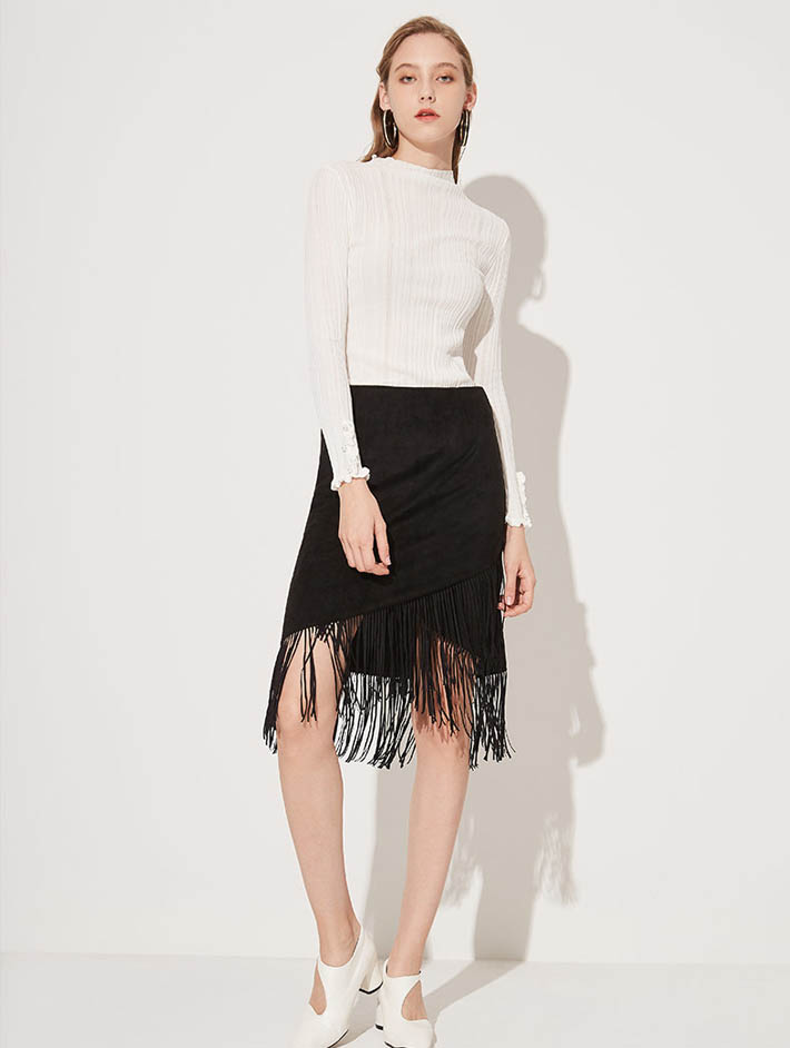 白色的緊身羊毛衫與黑色麂皮絨流蘇短裙,黑白搭配