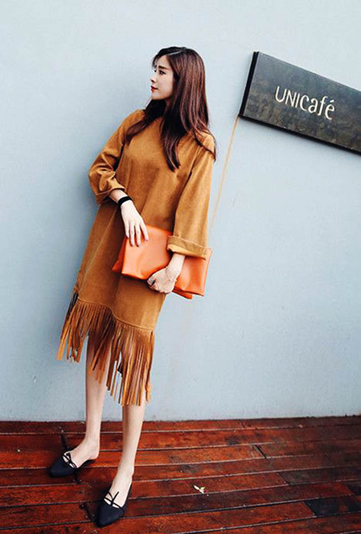棕色麂皮絨流蘇長(zhǎng)裙。