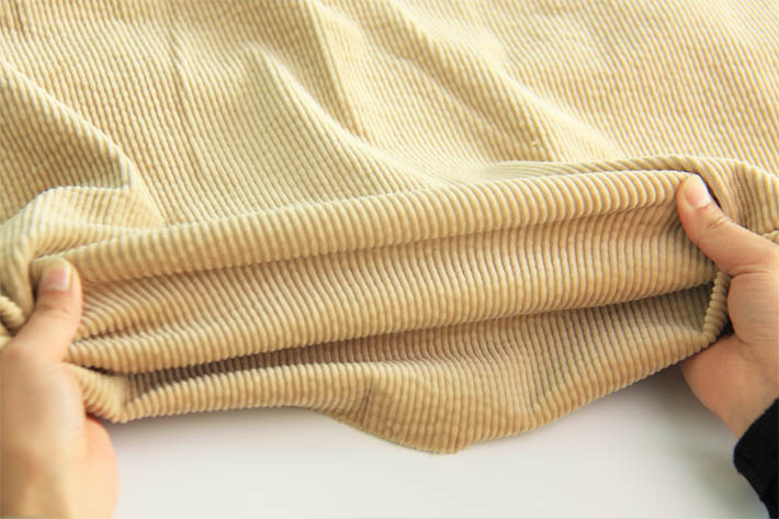 2.泡泡燈芯絨縮率較大,特別是成衣尺寸縮率較難控制。這也是泡泡燈芯絨最大的缺點(diǎn)。特別是追求價(jià)格便宜,染廠工藝沒(méi)有做全,現(xiàn)在很多做的是半工藝,坯布直接染色,沒(méi)有預(yù)縮到位,做成的成衣水洗縮率更大,風(fēng)險(xiǎn)也在此。