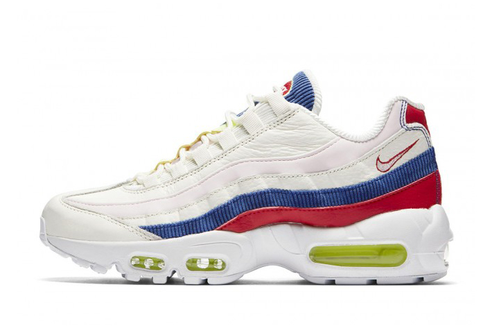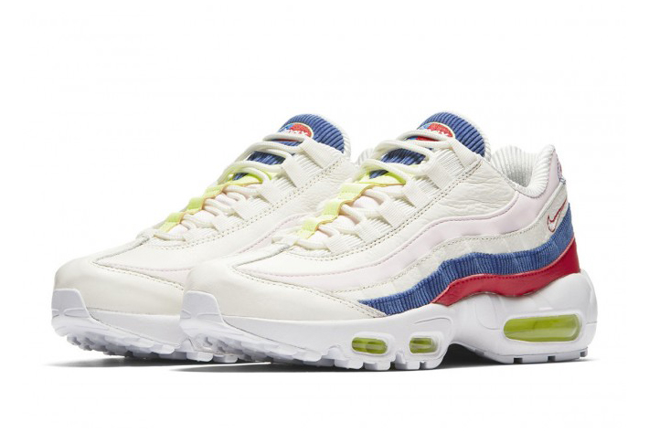 Nike Air Max 97,白色和藍色的燈芯絨拼接粉色和白色的高級皮革,再用熒光綠和紅色細節(jié)點亮整體色彩,可謂大師級配色,清新富有活力。