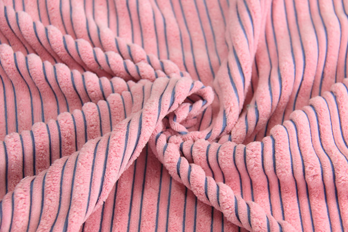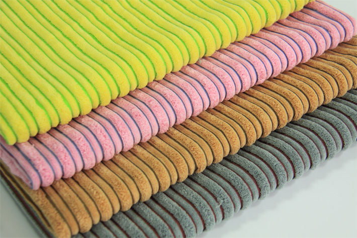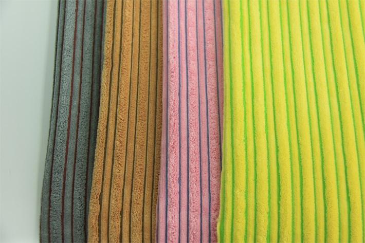 2.5條雙色陽(yáng)離子燈芯絨,屬于錦滌燈芯絨,在燈芯絨地組織織造中加入了陽(yáng)離子紗,利用陽(yáng)離子紗跟普通的滌綸紗吃色能力不同,在染色過(guò)程中,套用酸性染料,而形成雙色顏色效果!該顏色可以調(diào)配,比如:下圖絨面是粉色的,間隔之間的顏色是藍(lán)色,也可以調(diào)成丈青色!可以打色試樣!因其風(fēng)格獨(dú)特,新穎,而被廣泛應(yīng)用于玩具,家居用品,燈芯絨棉拖等領(lǐng)域!
