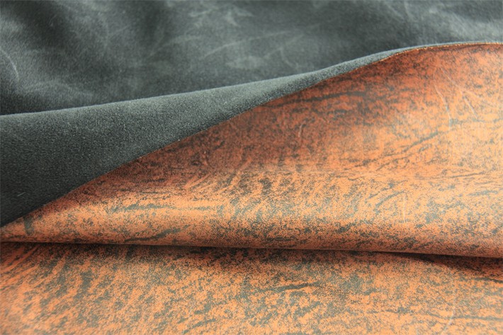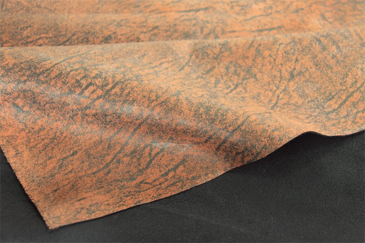燙金麂皮絨復(fù)合圈絨后壓花,多后整理工藝融合在一起,布料非常厚實(shí),具有仿牛皮效果。