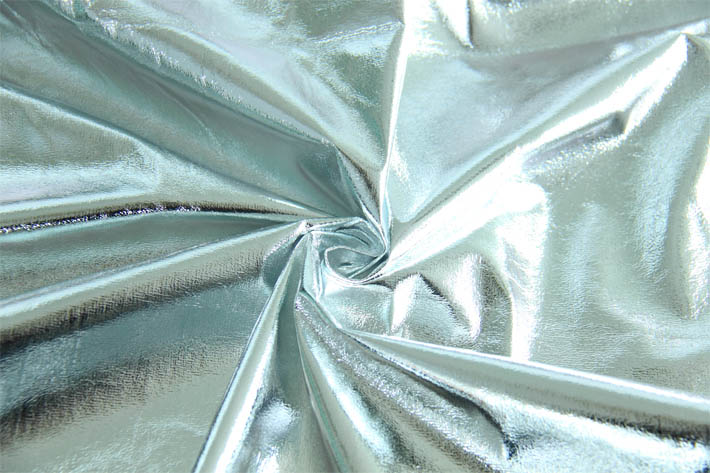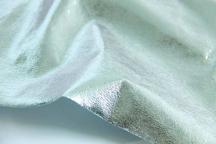 金屬元素也是一種時尚潮流,該款面料選用絨毛稠密的經(jīng)編麂皮絨進行燙銀滿版覆膜加工,因麂皮絨絨毛效果,表面形成自然細小的皺折紋路效果,具有較強的皮感,無彈經(jīng)編麂皮絨,質(zhì)地輕薄,撕裂牢度好,也可進行無紡布,針織底布等復合加工。可用于時裝,舞臺裝,鞋面,箱包,購物袋,禮盒包裝等。