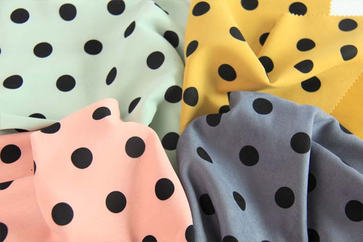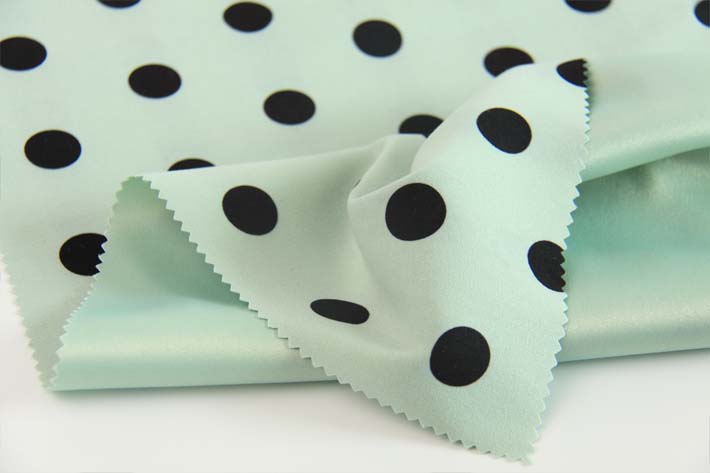 印花韓國(guó)絨,薄款,緞紋織物,微彈,輕薄,垂感好。最為流行的波點(diǎn)花型。